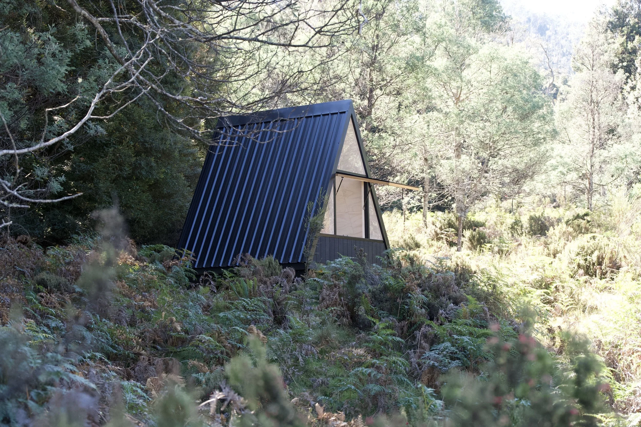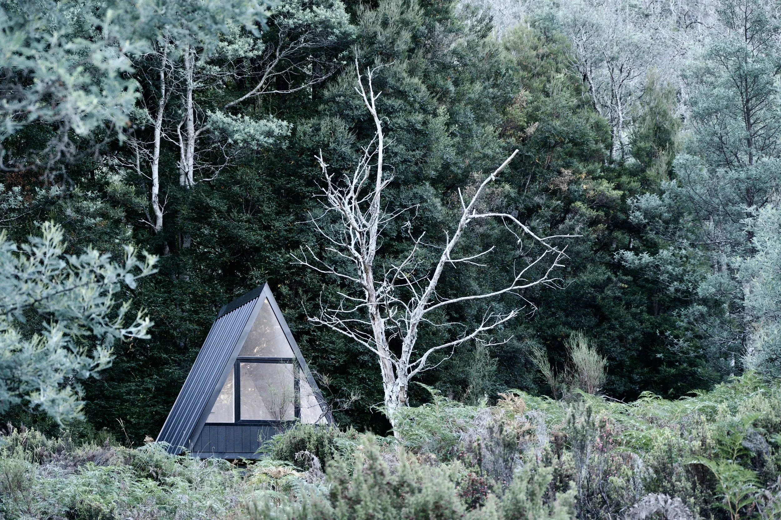 A pair of A-frame sleeping pods nestled into the mountains of the central highlands, offering walkers a place of refuge and understated luxury at the end of the day. With limited access available these pods were designed for helicopter install.