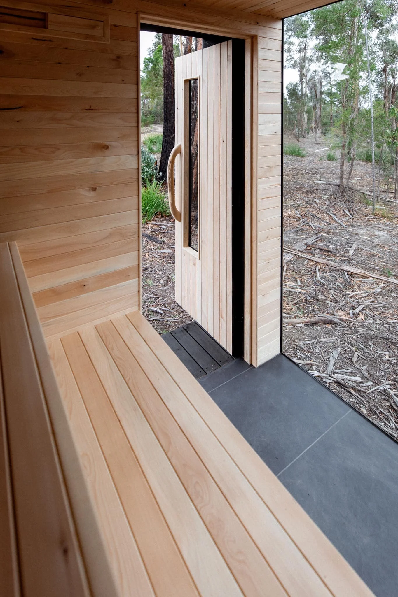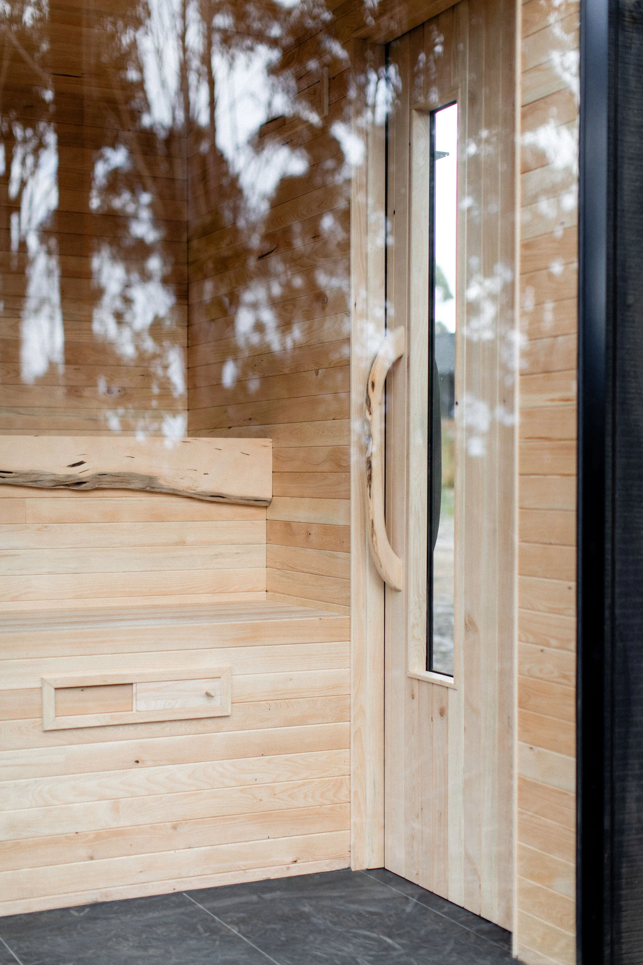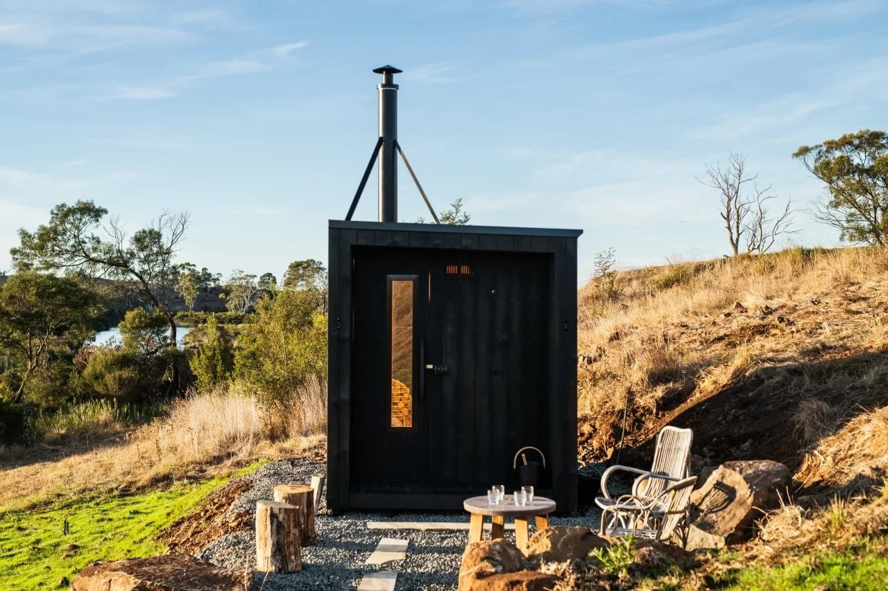 "I was lucky enough to secure a hand crafted sauna from Markus. A super stylish art piece really with charred black exterior that has slipped silently into its surrounds. The internal has a beautiful contrast of soft colours made from celery top pine with Huon pine detail for the door handle and light reveal. I’m super happy with it as are the guests at our sanctuary."